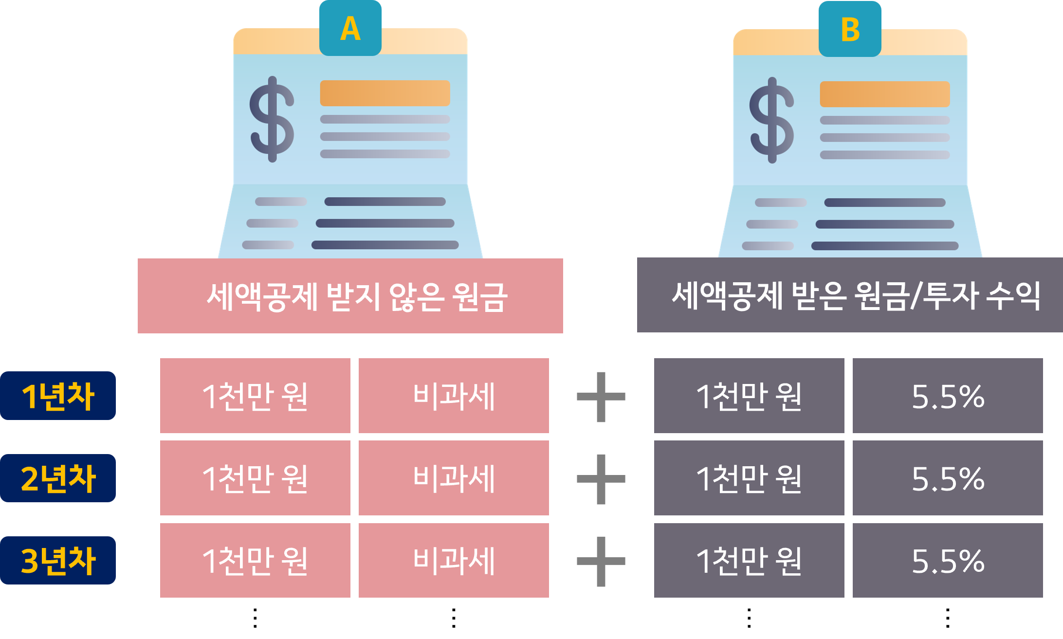 - B계좌에서 인출한 1천만원에 대해 저율과세 혜택을 받아 세금은 55만 원, 수령액은 1,945만 원이 됩니다.