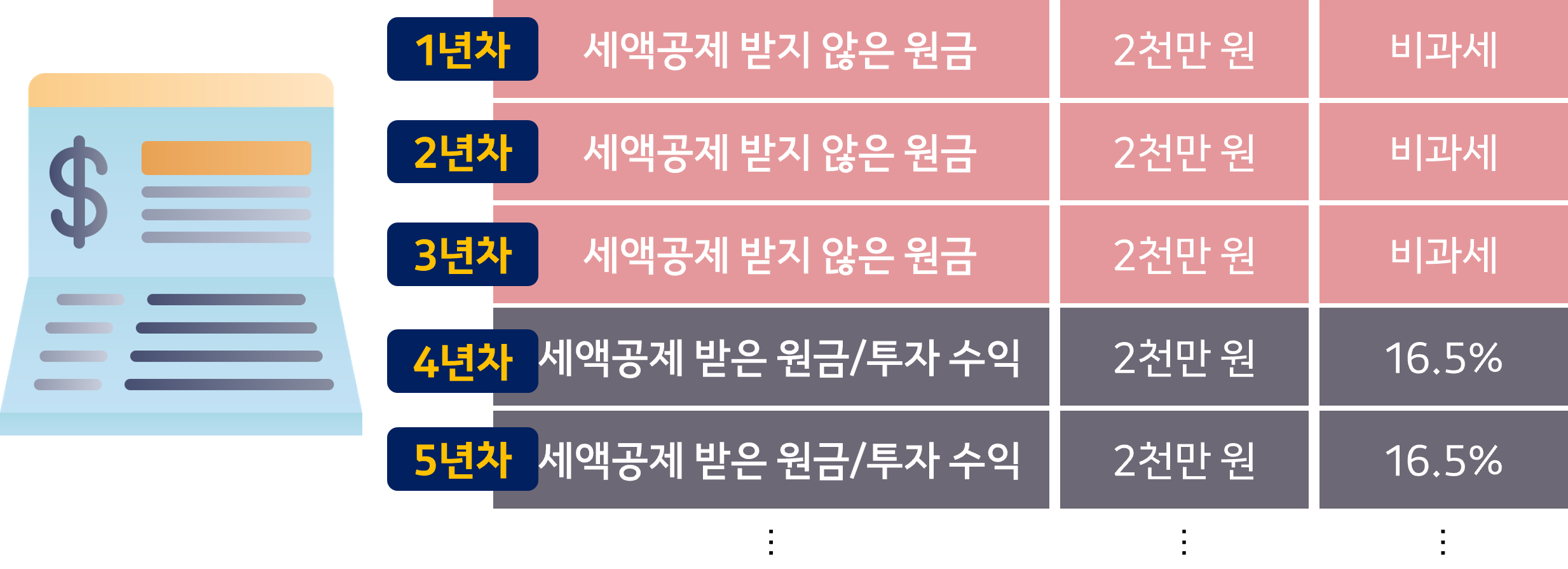 - 인출 순서대로 세액공제 받지 않은 원금부터 매 년 2천만 원씩 3년 동안은 비과세로 출금할 수 있습니다.
